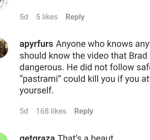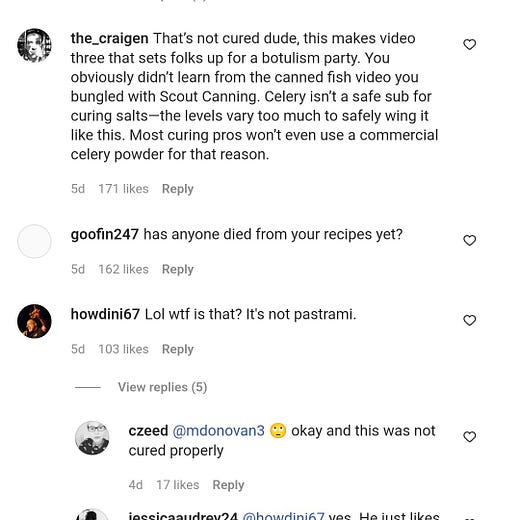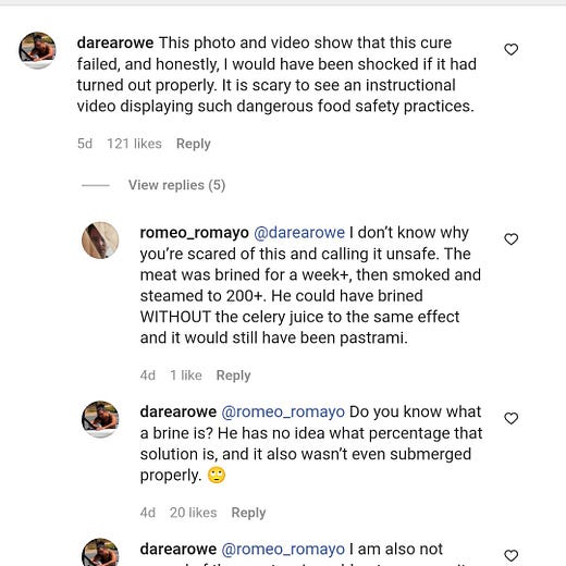 Anyway, yesterday I saw the below tweet and subsequent thread calling out one of Bon Appétit’s video creators for demonstrating an unsafe way of demonstrating how to make pastrami— which can lead to botulism. One follower commented, “hey I made the brisket recipe just as you described it and now I have absolutely atrocious diarrhea I mean mind boggling diarrhea did this happen to you after you ate it thanks”